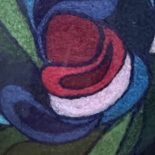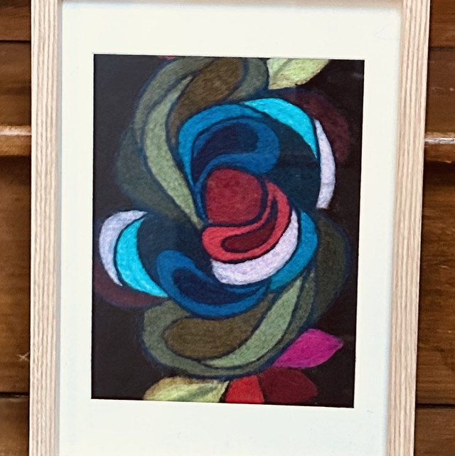 Merino wool and biodegradable fibre used to create those past feelings of the 70s era of colour and movement. Hand felted onto a linen backing.